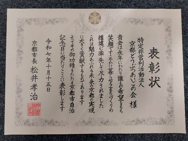 京都市自治記念式典にて「みらいの京都まちづくり推進表彰」として表彰されました。