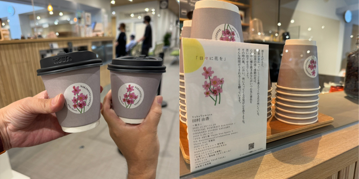 写真は、1階のコーヒースタンド「NAKANOTEICOFFEE西山」の期間限定、秋を感じるデザインカップです。障がいがあるアーティストの作品です。