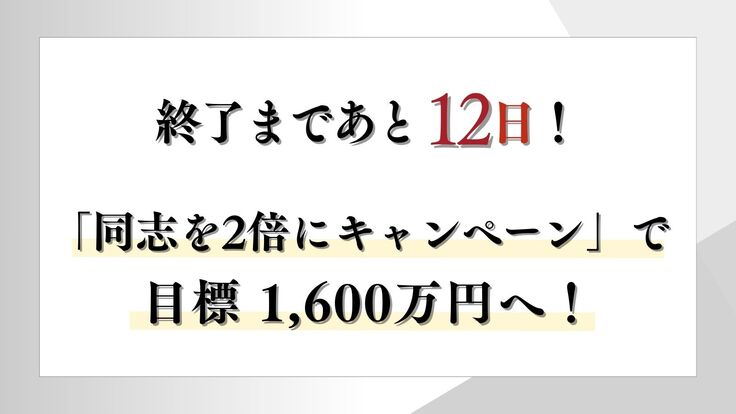 9月3日(水)の終了まで残り12日。一人でも多くの“同志”とつながるべく、本日から「同志を2倍にキャンペーン」を実施いたします。