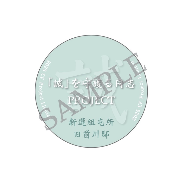 その力強い文字を中央に据え、プロジェクトテーマの「『誠』を守護る同士PROJECT」と「新選組屯所 旧前川邸」の名をあしらった、クラウドファンディング限定デザインの缶バッジです。