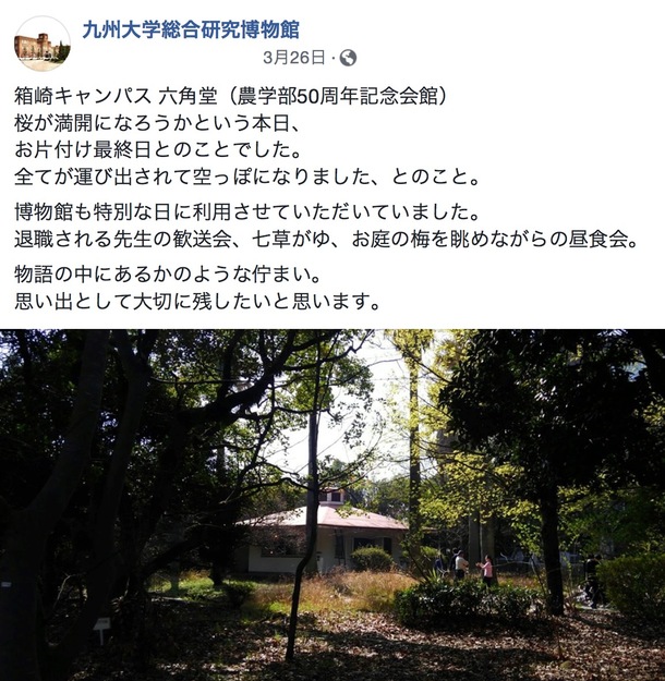 同時に、箱崎キャンパス中央図書館裏の、知る人ぞ知る自然派レストラン「六角堂」も完全閉鎖となりました(実質的には、すでに3月で閉鎖)。