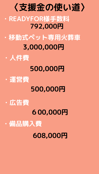 皆様からいただいたご支援は、ペット専用移動式火葬車の購入と運営費・人件費・広告費・備品購入費に充てさせていただきます。