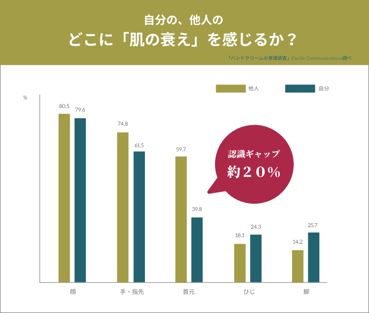 肌の衰えを感じる部分について、自分と周囲との認識のギャップが最も大きいのが「首元」でした。自分の首元は手元と比べるとどうしても見る機会が少ないので、見落としがちなんです。