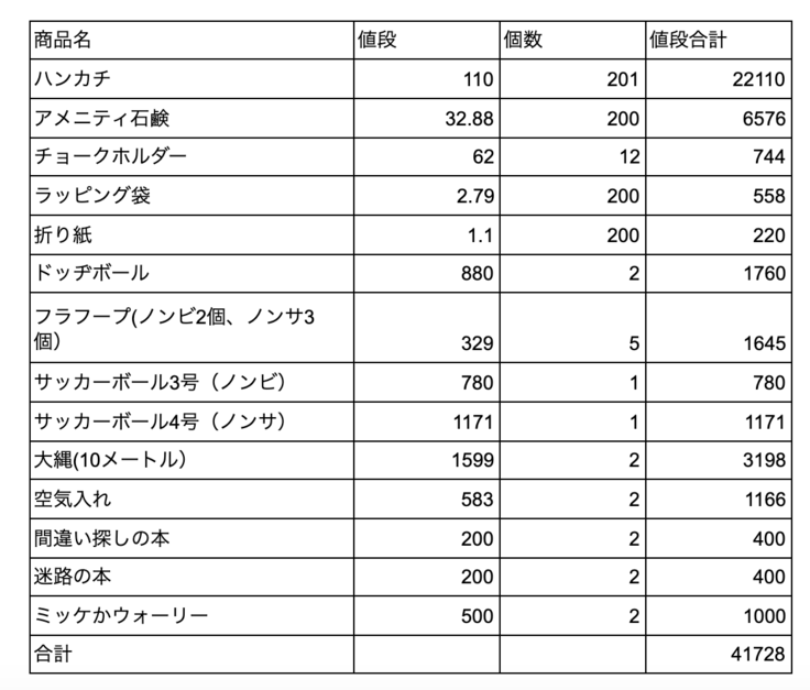 しかしながらこれらのプレゼントを購入しようとした際、同じサイトで同じものを閲覧しましたが、サイトの閲覧日から3ヶ月以上経っていた関係で、値段が変更となっているものが複数ございました。メンバー間で再び話し合い、値段と質を考慮していくつかのもののメーカー等変更させていただきました。以下の表の通りにプレゼントを購入いたしました。