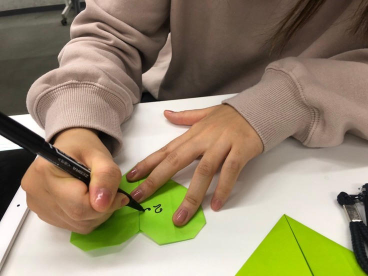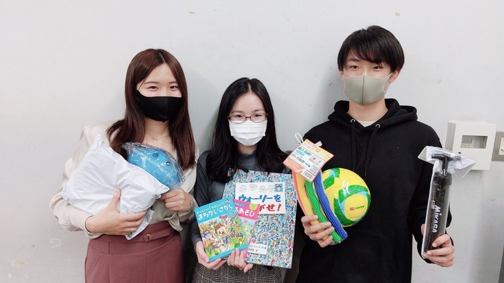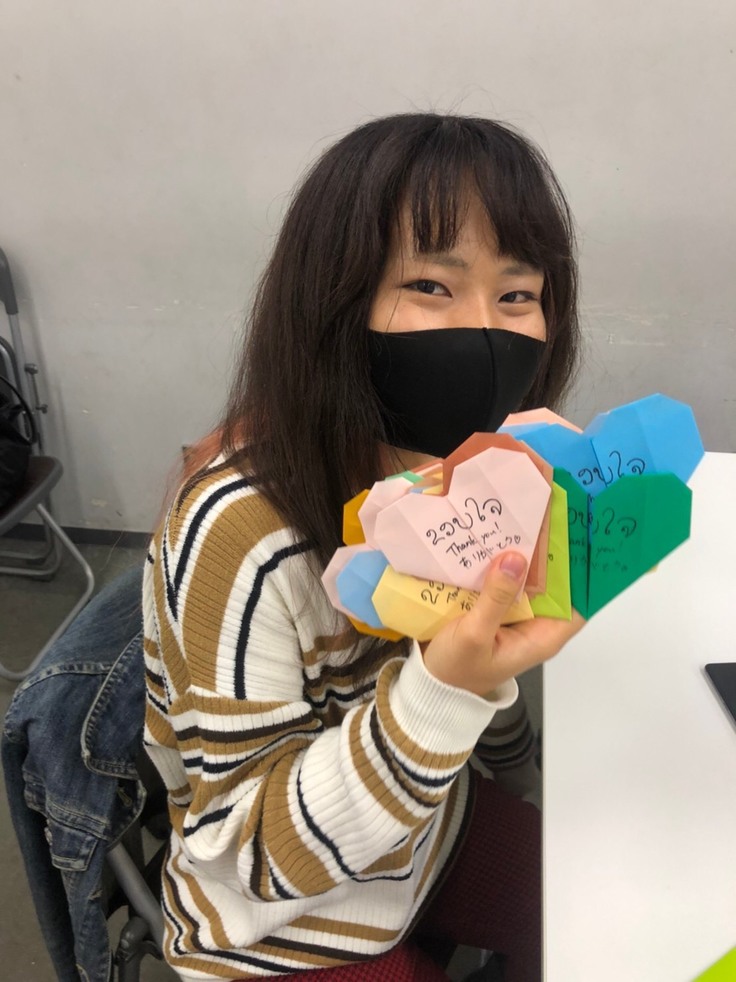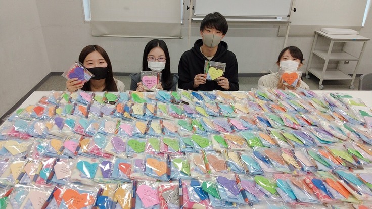 添付いたしました写真のように、メッセージ入り折り紙や、プレゼントの梱包をメンバーで協力しながら行っております。(三色ボールペンはご協賛でいただきました。)