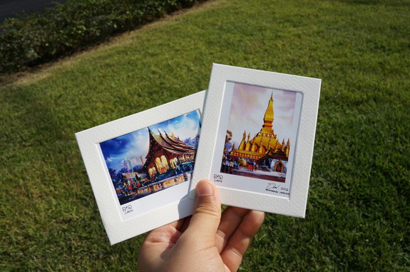 ラオスの風景や建物が描かれているマグネットです。冷蔵庫に簡単に貼ることができます。まるで額縁に入っている絵のようなマグネットです。いろいろな絵がありますので、その中の一つを選んでお送りします。