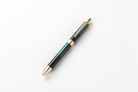 複合ボールペンはシャープペンと赤・黒のボールペンの3種が使えるマルチペンです。2016年春より、ペン先やボディーの金具が、玉虫塗の艶やかな色調を引き立てる落ち着いた金軸となり、より高級感のある仕上がりです。一つひとつ塗りと研磨を繰り返し、銀のぼかしを入れることで独特の風合いのグラデーションを作り出しています。