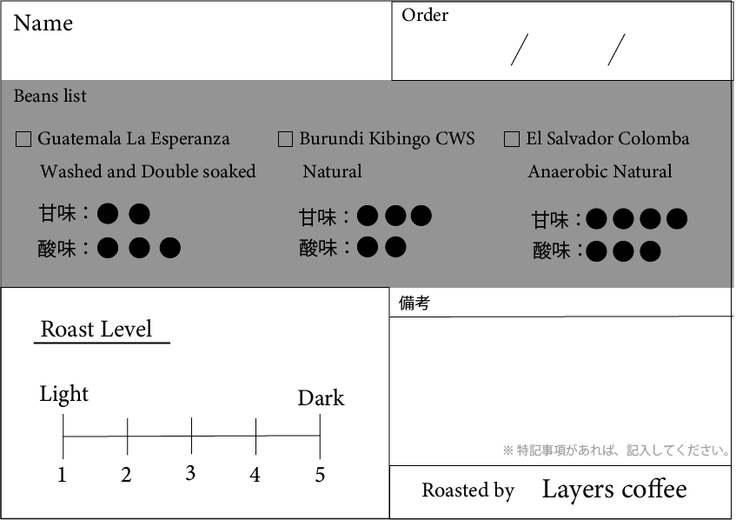 オーダーシートを作成し、自分専用のコーヒーを楽しんでいただきたいと思っております。