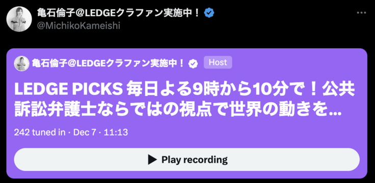 ・代表亀石のX(https://x.com/MichikoKameishi)のアカウントをフォローください。LEDGEのX(https://x.com/LEDGE_law)でもリポストしていますので、こちらからもLEDGE PICKSを見つけていただけます。