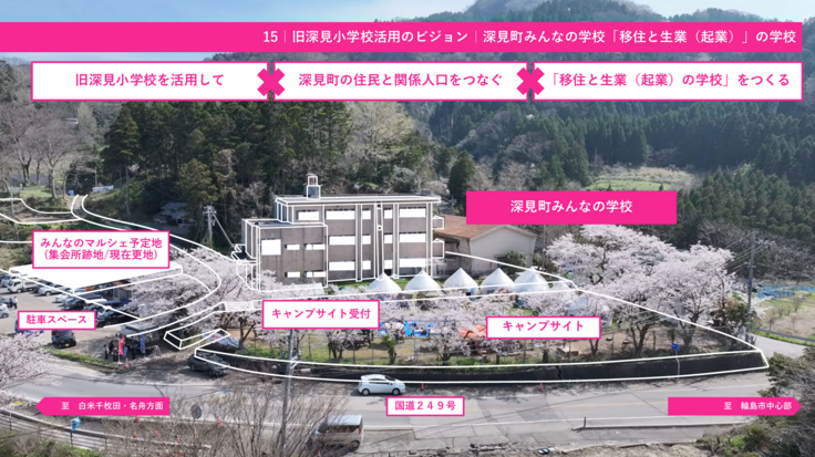 今行われているのはBBQ場、キャンプ場の開設(準備中)やラジコンサーキットの設営、広場としての貸し出しなどです。その一環として、かつて地域の中心だった旧深見小学校をブロックのおもちゃで再現し、その周りで子供たちが自由に遊べる空間をつくるプロジェクトを立ち上げました。