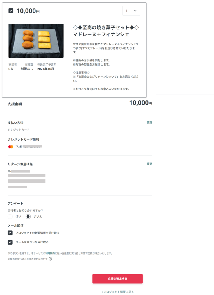 確認画面より登録情報の記載に誤りがないかを確認し、「支援を確定する」をクリックしてください。
