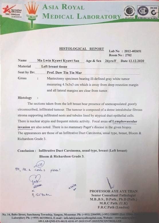 収入源を失っていた彼女は、少しでも治療費を抑えようと、多少安価な公立病院での治療も考えましたが、新型コロナウイルス感染症やクーデターの影響で、私立病院での術後治療を余儀なくされてしまいました。