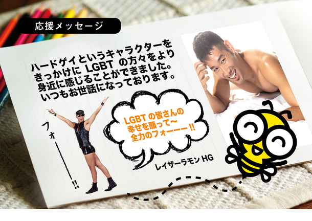 「ハードゲイというキャラクターをきっかけにLGBTの方々をより身近に感じることができました。いつもお世話になっております。LGBTの皆さんの幸せを願って〜全力のフォーーーー!!! レイザーラモンHG」