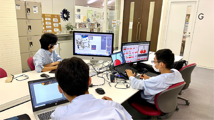 私たちは、ICTツールを活用して、イラストやグラフィックデザイン、アニメーションや3DCGなど、進化するデジタルツールを真剣に学びたい小中高生7名活動しています。教育委員会にも協力していただき部活動として活動し、技術のスキルアップはもちろん地域課題を解決できる人になれるよう目指しています。