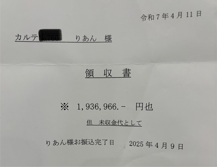 医療費支払い領収書 (未払いの医療費を最終計算してもらい、金額を教えてもらった後に動物病院さんへお振込にて完済しました。)
