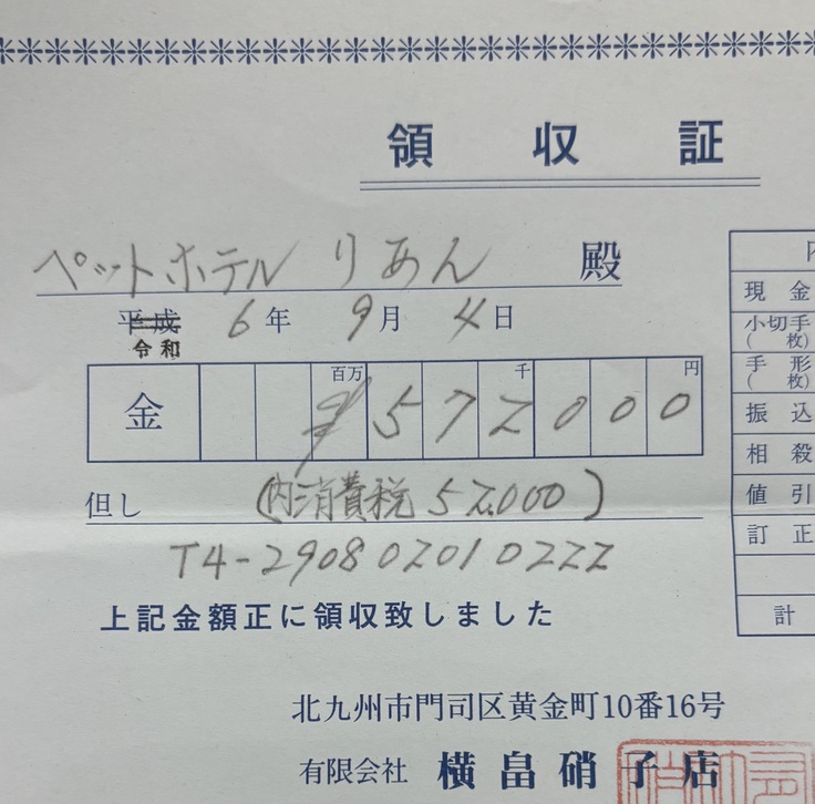 補修費支払い領収書(猫ちゃんたちが住んでいるお部屋のガラス破損だった為早急に補修しましたが、保険で賄うことが出来ず無理な支払いとなり運営費に大打撃となりました…。)