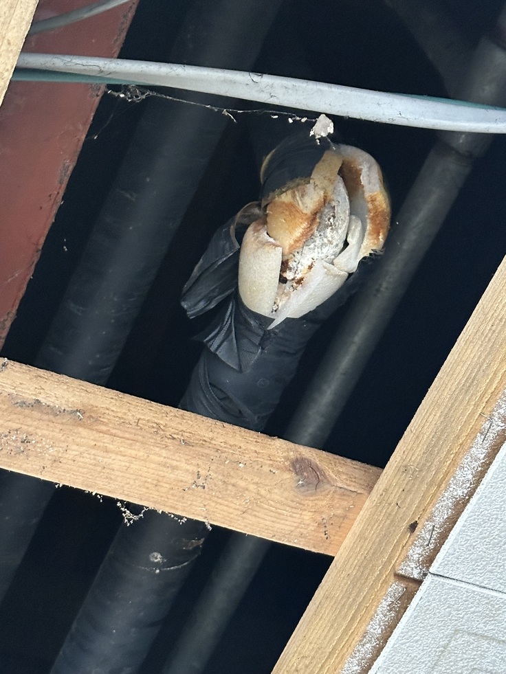 壁を壊して中を確認すると劣化した水道管と腐敗した保護材。