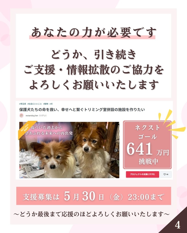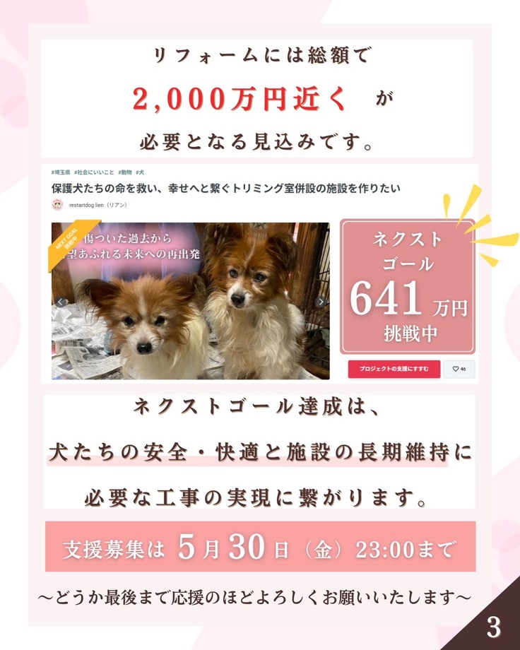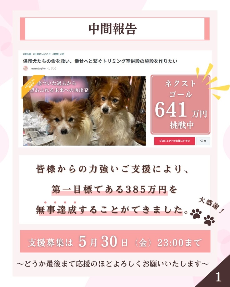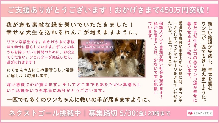 READYFORで挑戦中のプロジェクト「保護犬たちの命を救い、幸せへと繋ぐトリミング室併設の施設を作りたい」ですが、おかげさまで公開から約2週間で第一目標である385万円の目標金額を無事達成することができました。