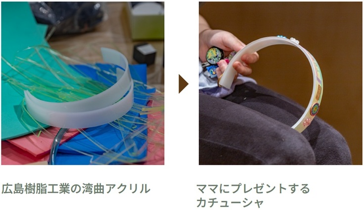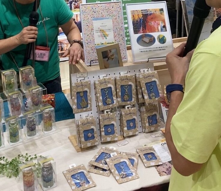 広島平和記念公園に捧げられる折り鶴の再生紙を使ったアップサイクル製品(キーホルダー、ハーバリウムなど)、被爆樹木剪定枝のアップサイクル製品(キーホルダー、チャームなど)を展示販売。