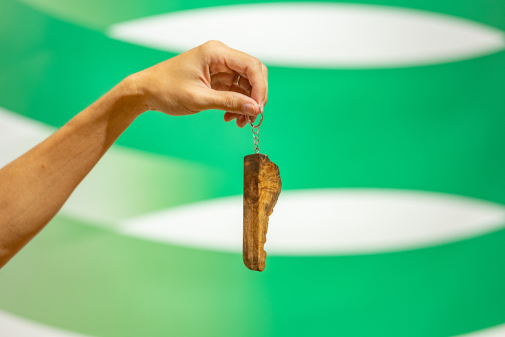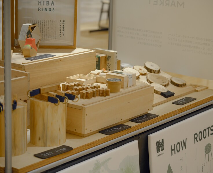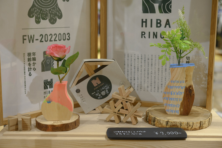 間伐や特殊伐採された樹木の切株情報を参照できるトレーサブルウッドプロダクト。製品ごとにスマホから気軽に"誕生地"や樹齢、歴史も見ることができ、年輪に刻まれている物語を感じることができる仕組みになっています。今回はコースター、一輪挿し、積み木、キーホルダー、ブックエンドなどを展示販売。