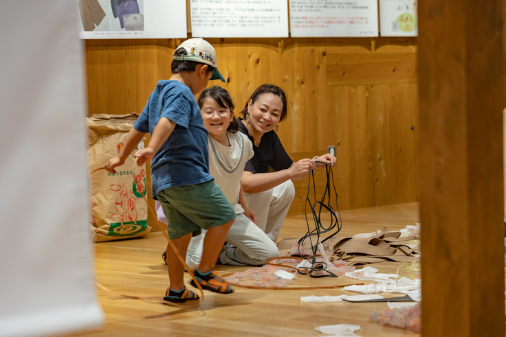 おもちゃで部屋がぐちゃぐちゃになっても、片付けて隠すのではなく、見える棚に飾っておけるような、「しまう」ことと「あそぶ」ことを兼ねそなえるものを製作。今回は仏壇用木材端材を利用して作った積み木や、アクセサリー、モビール等を展示販売。