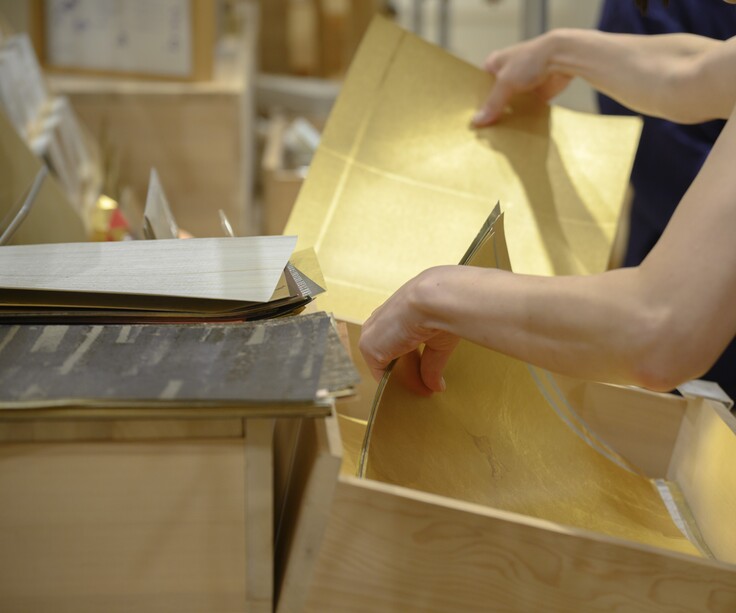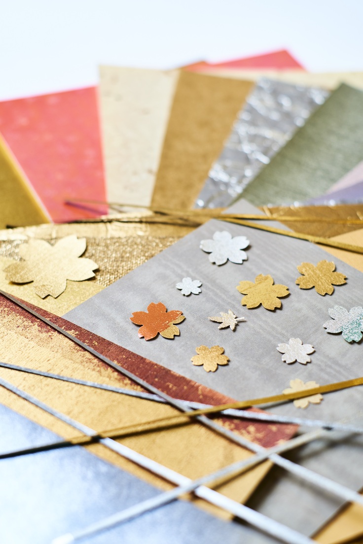 創業120年の箔押し紙メーカー。金銀紙の端材をアップサイクルした箔雑貨を展示販売。