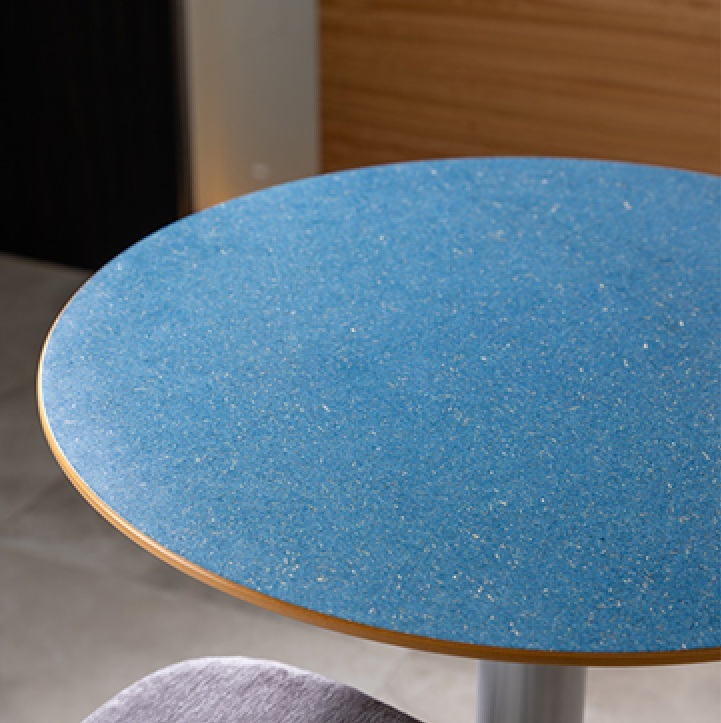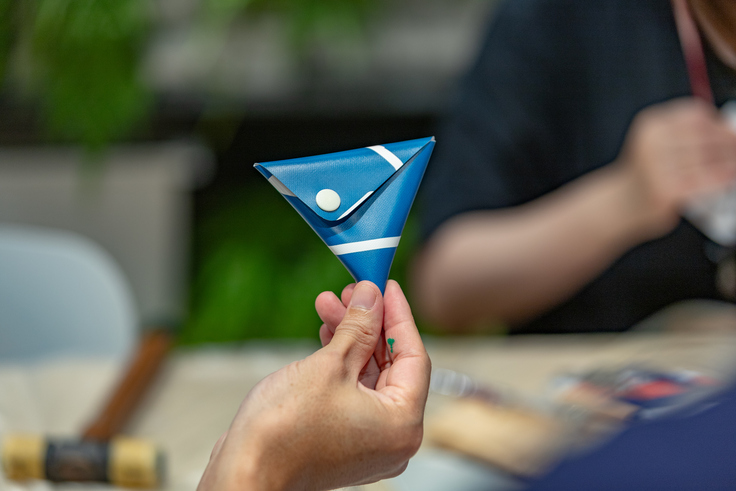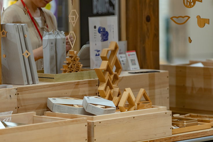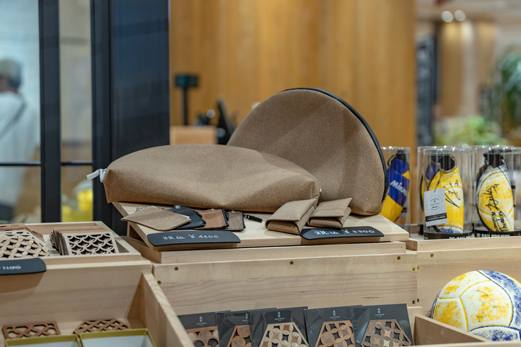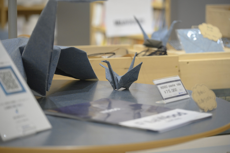 天然木突板を使った化粧板メーカー。自社の天然木突板端材とデニム専業生地メーカー・カイハラ産業の染色糸端材を混ぜて作ったサステナブル素材「INDIGO」を開発。今回はINDIGOを使った折り紙、コースター、御朱印帳、カウンターテーブルを展示販売。