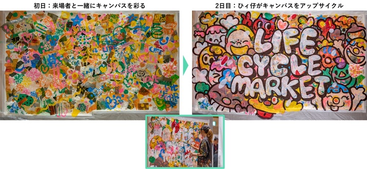 イベント初日は来場者と一緒に端材を使ってキャンバスを彩りました。2日目はひィ仔さんがアートでアートをアップサイクル。平和とアップサイクルを象徴する素敵な作品が完成しました!!