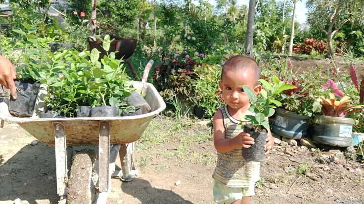 インドネシア料理は酸味を加えるためにライムを良く使います。食堂のテーブルにも自分好みの酸っぱさにできるようカットされたライムが置いてあることがあります。ライムはスンバ島で育つ植物ですが、ライム農家として大規模に栽培する人はあまりいないので、スンバ島で使われるライムの多くは他の島から仕入れています。そこで、私たちLIFEは村の人たちが将来ライムの売り上げから現金収入を得られるように、2,000本の苗木を植えました。