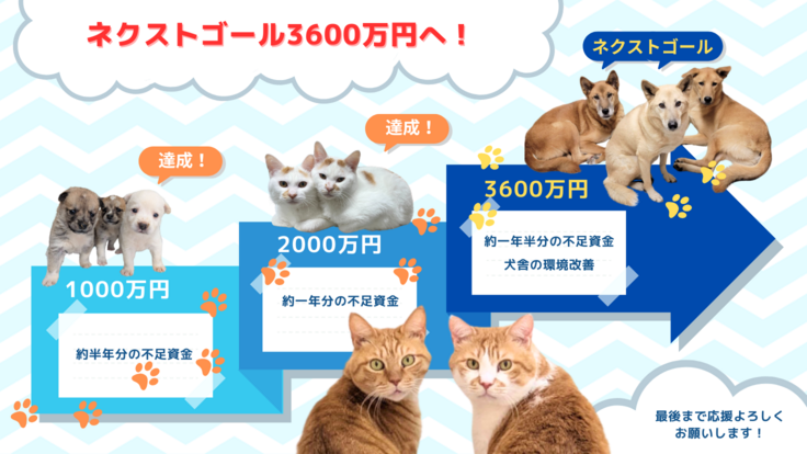 第三目標は3600万円を掲げて、もう半年分の不足資金と犬舎の環境改善を目的として挑戦します。