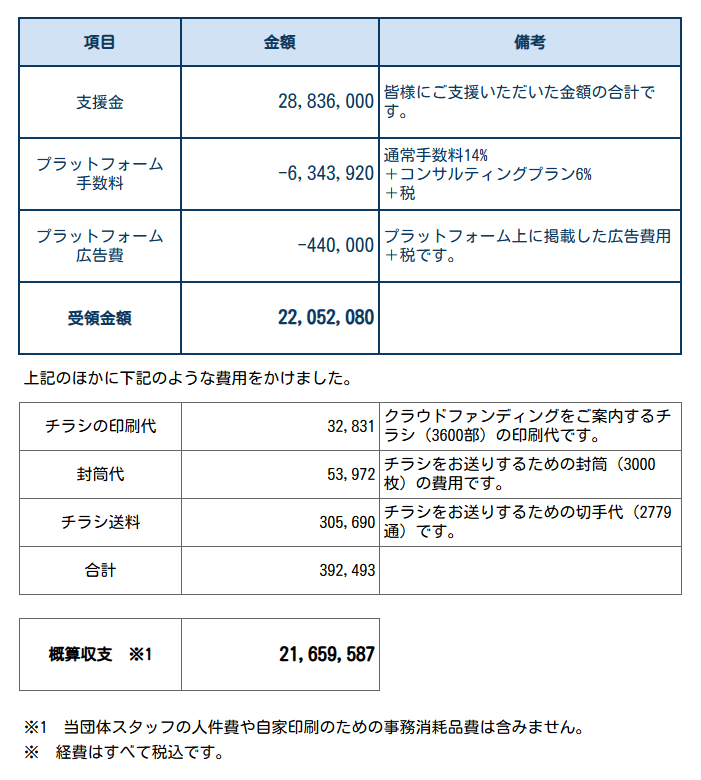 当初は目標金額が1,000万円であったため、達成した場合の手数料は約200万円程度を見込んでおりました。この額は、当団体の例年の広告宣伝費と比較しても妥当な範囲と考えておりましたが、予想を遥かに超えるご支援をいただいた結果、手数料も比例して大きな金額になりました。