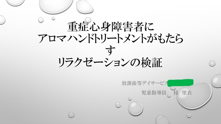 そんな、仕事とアロマ漬けの日々の中で、前施設において事例研究発表(令和2年度)が行われることとなりました。そこで私が取り上げた事例が、「重症心身障害者にアロマトリートメントがもたらすリラクゼーションの検証」です。