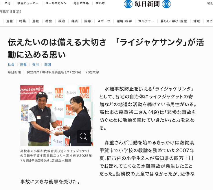 みなさんからのご支援で各地に寄贈した「ライフジャケット」ですが、各地で活躍している…というお知らせが届いております。現在、各市町でWeb掲載の調整をしてくださっています。教材開発中のウキウキくんも大活躍しているようです。お盆明け、毎日新聞さんが記事にしてくださいました。
