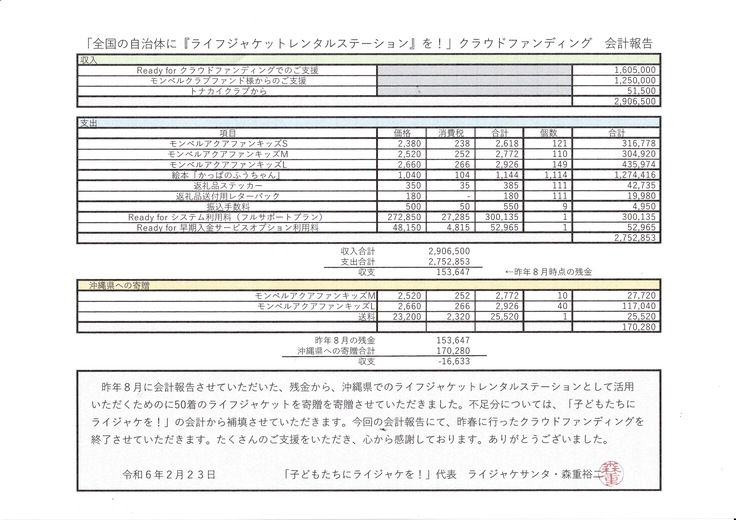 8月に会計報告をさせていただいた時の残金を使って、沖縄県でのライフジャケットレンタルステーション開設のための50着の寄贈をさせていただきました。これで合計8県に430着のライフジャケットを寄贈することができました。本当にありがとうございました!最終の会計報告を画像で添付しておりますのでご確認ください。