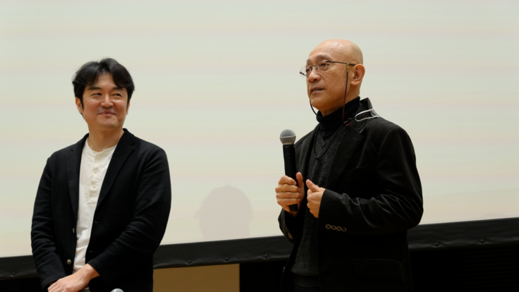 写真:上映会でのドキュメンタリー映像の藤井裕也監督(右)と代表の清水