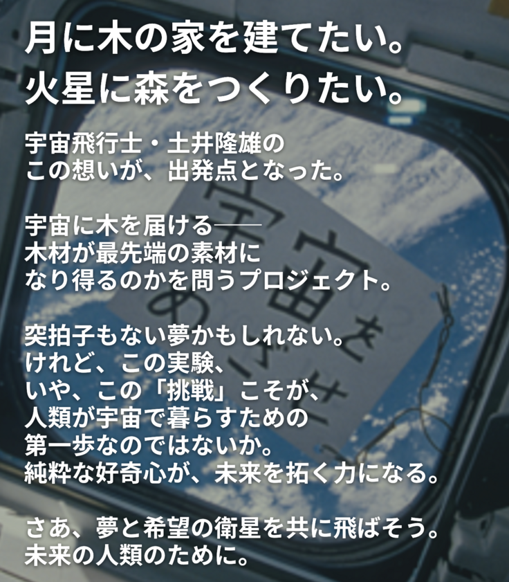 ページをご覧いただきありがとうございます。京都大学 宇宙木材プロジェクトチームです。まず始めに、2023年のクラウドファンディングでは多大なるご支援をいただき誠にありがとうございました。