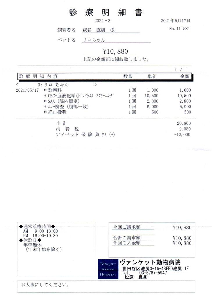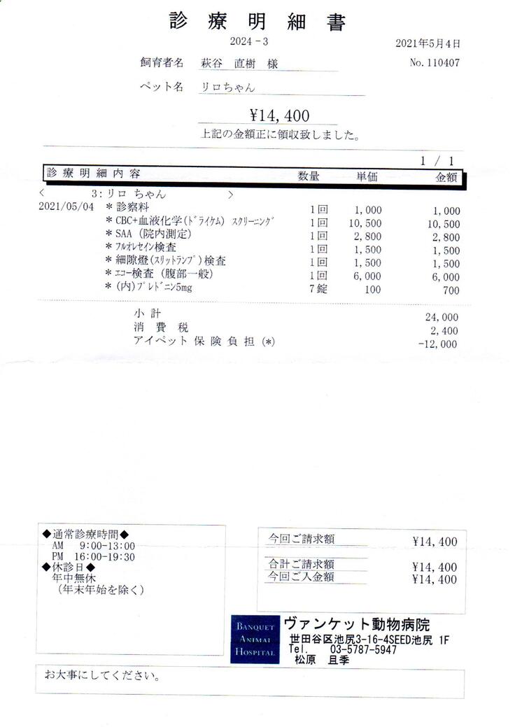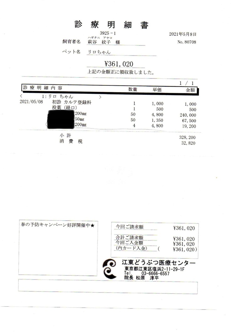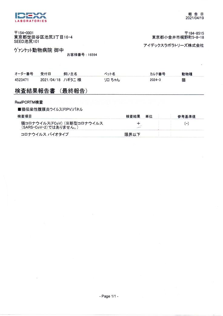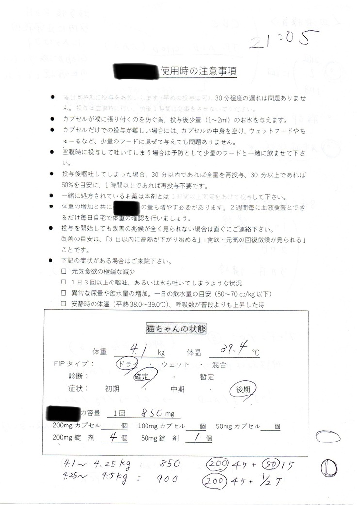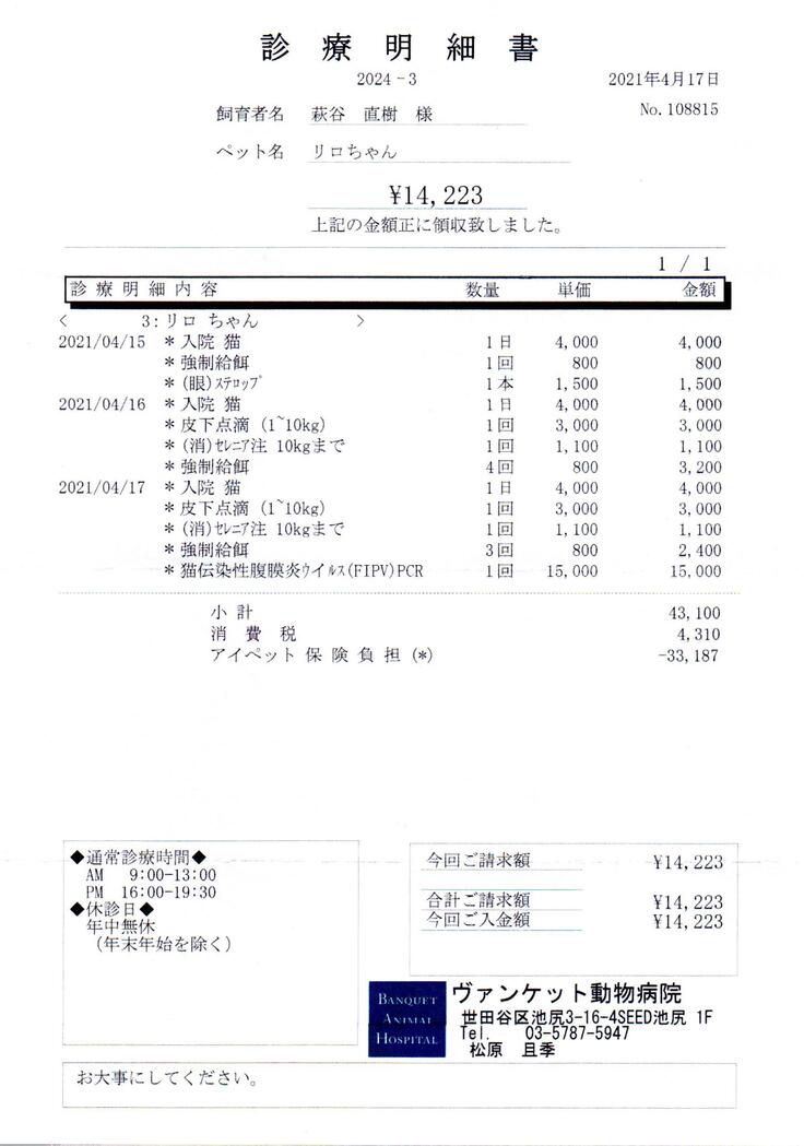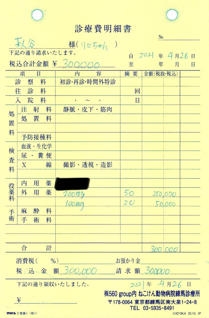 FIP発症に伴って発生した下記の治療費に充てさせていただきます。