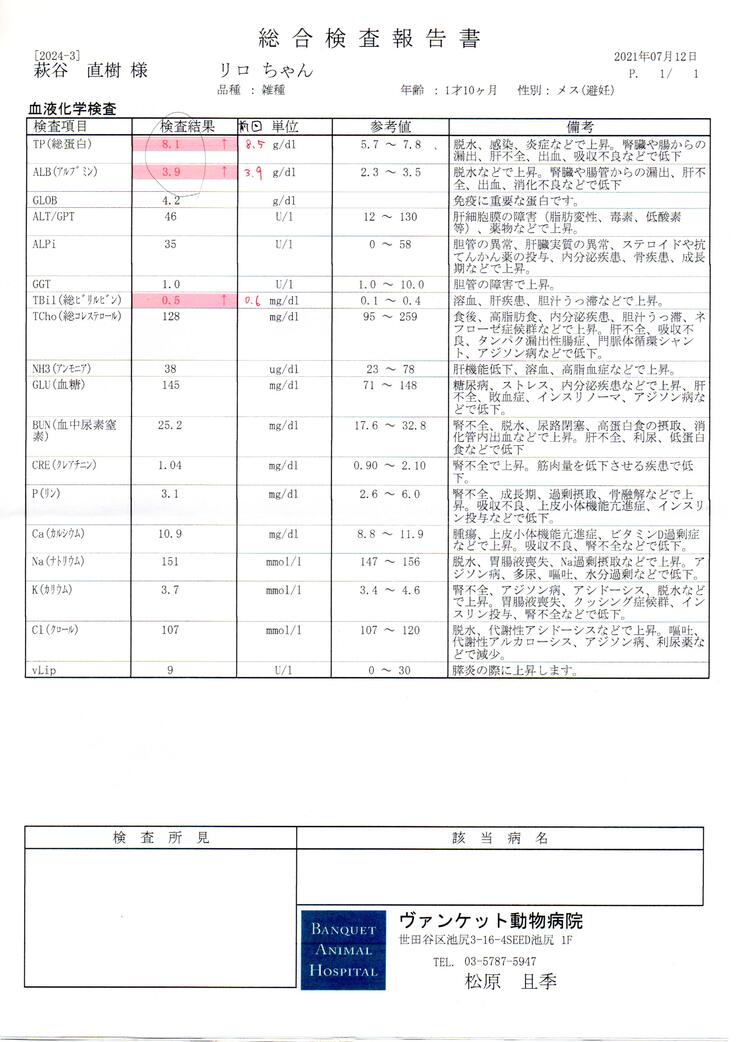 グロブリンなどの数値は今後しっかりと経過観察していきましょうとのことで