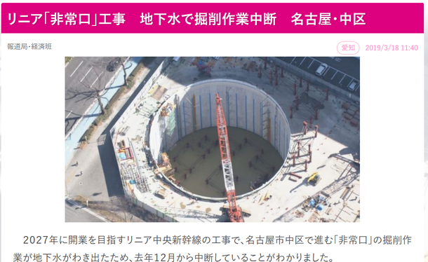 さて、リニアの本丸工事であるトンネル工事は本格的にはほとんど始まっていませんが、その準備工事(立坑や斜坑の掘削、ストックヤードの建設など)では、ときおり鉄道会社の、いわゆる「想定外」が起こっています。