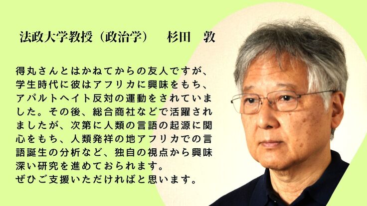 その後、総合商社などで活躍されましたが、次第に人類の言語の起源に関心をもち、人類発祥の地アフリカでの言語誕生の分析など、独自の視点から興味深い研究を進めておられます。