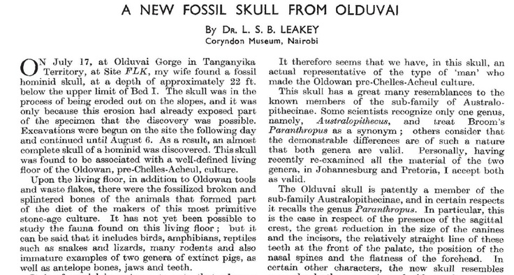 そうこうしているうちに、タンザニアで、ルイス・リーキーが、1959年8月15日のNatureに、自分の妻(2番目の)がジンジャントロプス・ボイセイの化石を発見したという記事を発表する。