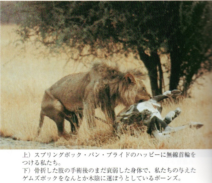 特にそれを感じたのは、カラハリに住み始めてすぐのころ。複雑骨折をして餓死寸前だった雄のライオン(彼らはボーンズと名づけた)に、外科手術をして、餌も与えたところ、そのライオンが驚くべき生命力で回復した(8 ボーンズ)。