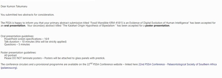 今朝早く、南ア古生物学会から、僕が提出した2本の論文が、第22回南部アフリカ古生物学会で受理されたという連絡がきました。