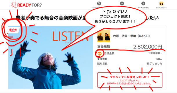 こんにちは。『LISTEN リッスン』宣伝スタッフの宮本です。2ヶ月半にわたって実施してきたクラウドファンディングが昨日4月13日(水)の23時をもって終了しました。