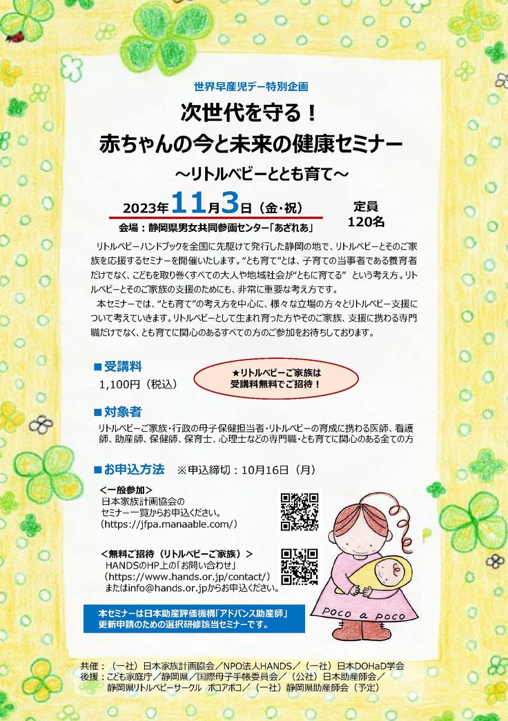2023年11月3日(金・祝)に静岡市にて、「世界早産児デー特別企画、次世代を守る! 赤ちゃんの今と未来の健康セミナー ~リトルベビーととも育て~」を、日本家族計画協会さん、日本DOHaD学会さんと一緒に開催いたします。リトルベビーハンドブックを全国に先駆けて作成、運用した静岡の地で、リトルベビーとそのご家族を応援するセミナーを行いますので、是非、ご覧ください。