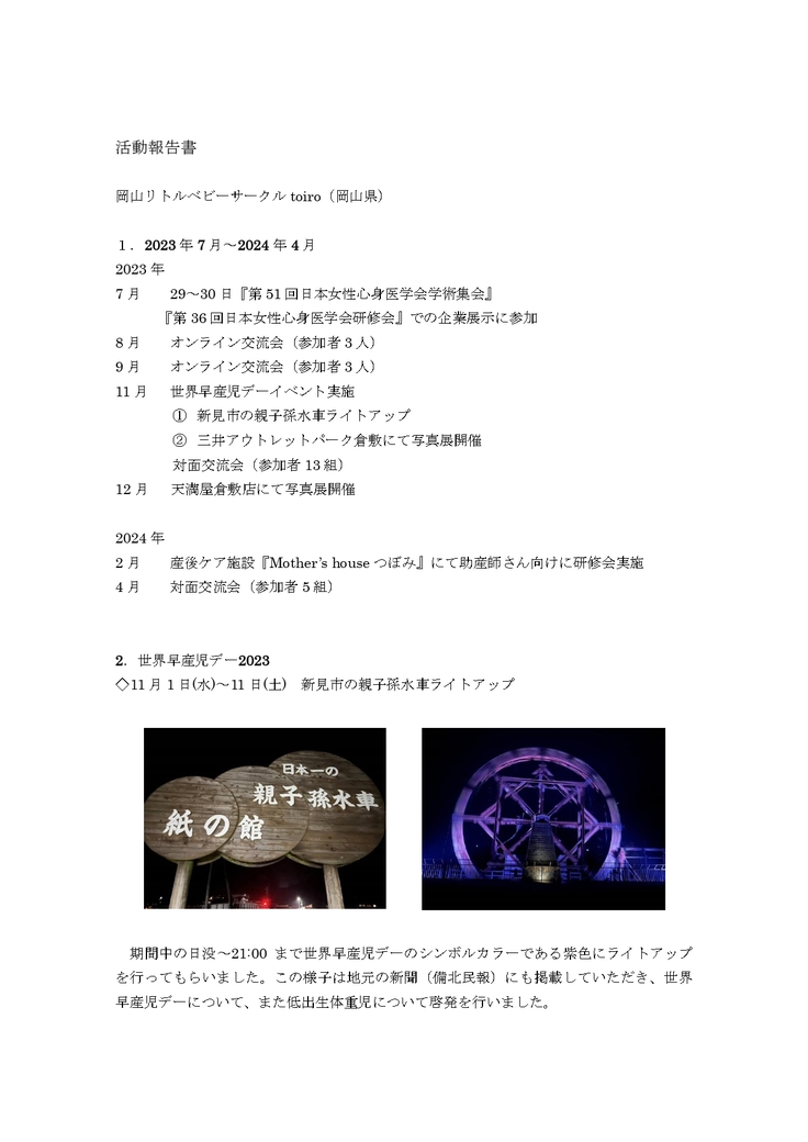 岡山リトルベビーサークルtoiro(岡山県)より活動報告が届きました。