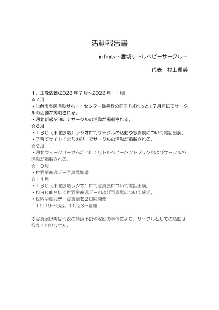 infinity~宮城リトルベビーサークル~(宮城県)より活動報告が届きました