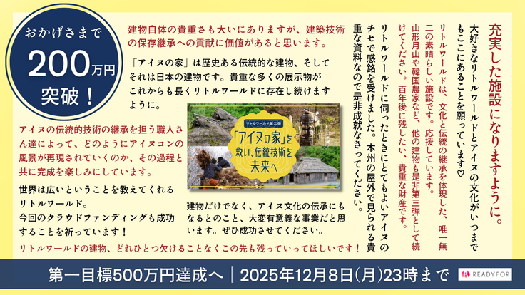 目標金額である500万円に1円でも届かなかった場合、すべてのご支援が返金となり、「北海道 アイヌの家」の母屋をはじめとする建物の修復を実現することができません。