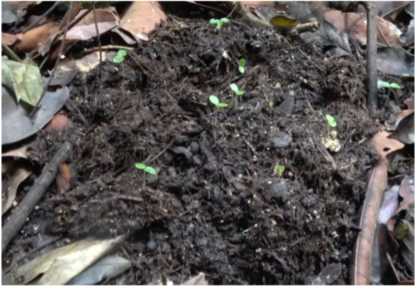 動画の中盤から後半にかけては、地面に落ちた果実やマルミミゾウの大きな糞を見ることができるかと思います。マルミミゾウはジャングル内を練り歩き、沢山の果実を食べます。この種子は消化されずに、糞の中に排出されます。証拠として、ゾウの糞に新芽が生えている様子が確認できると思います。