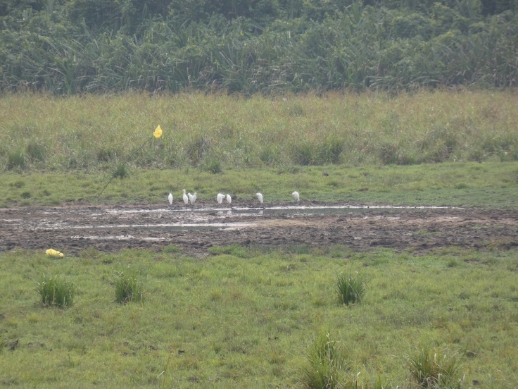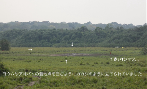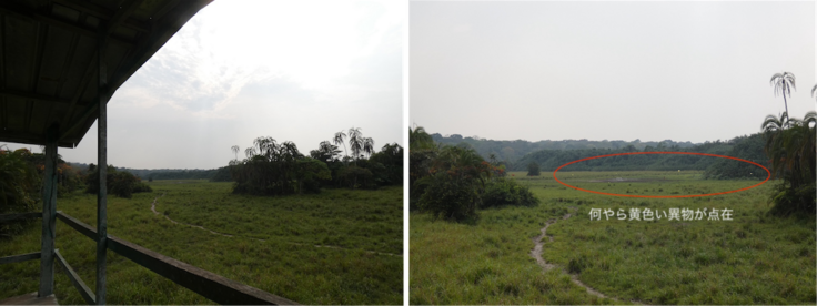 午後3時半過ぎにジャンギの観察台にたどり着くと、見晴らした湿地に何やら異物が…?